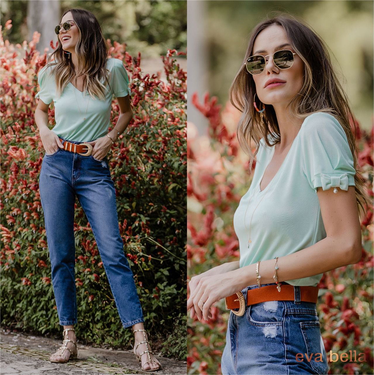 Blusa Tie Day decote V e detalhe de Laço com peróla na manga.