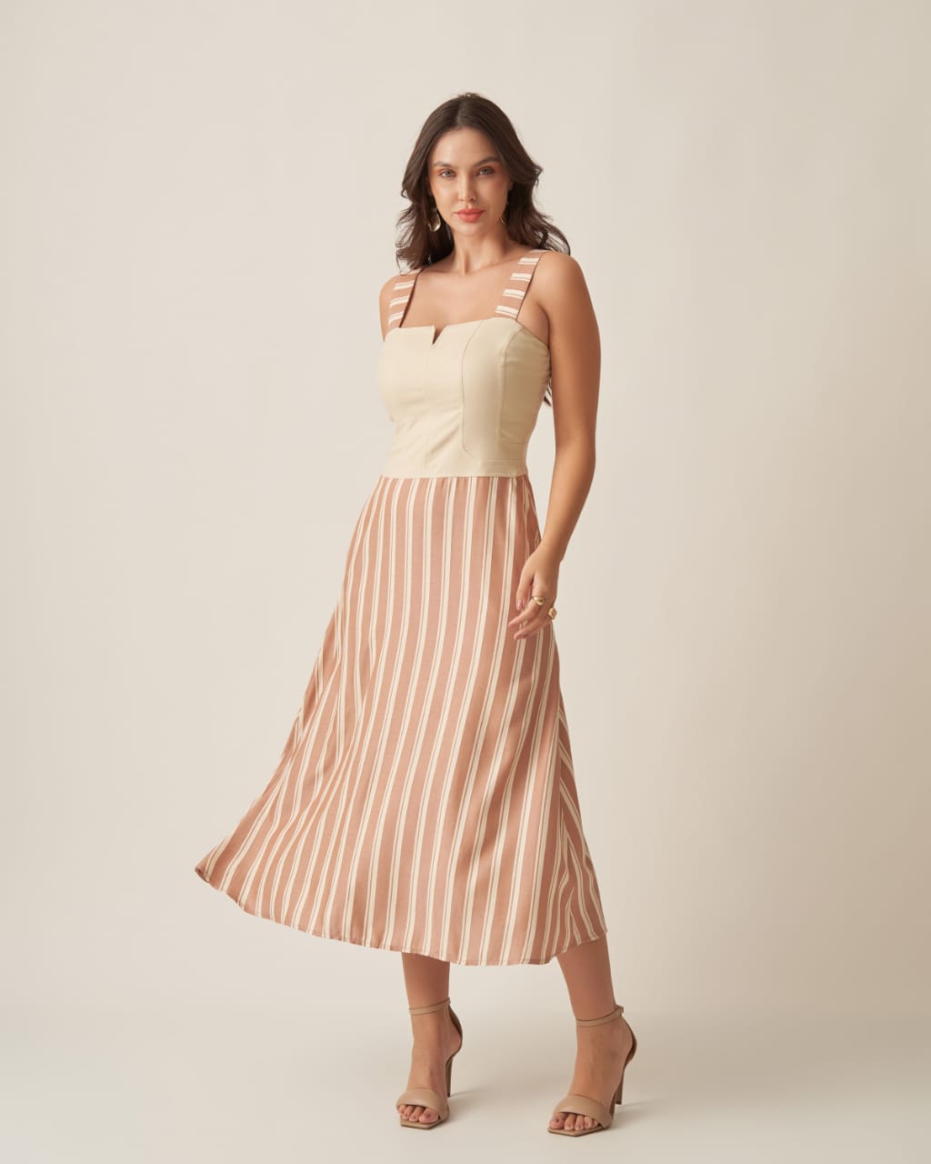 Vestido midi elegante confeccionado em tecido leve e confortável. O modelo possui parte superior lisa em branco com alças largas listradas, e saia com listras verticais que alongam a silhueta e trazem um toque moderno. Ideal para ocasiões casuais ou eventos mais sofisticados, pode ser combinado com sandálias, rasteirinhas ou salto. Um look versátil e atemporal para todas as estações.